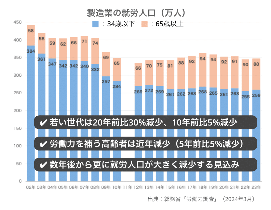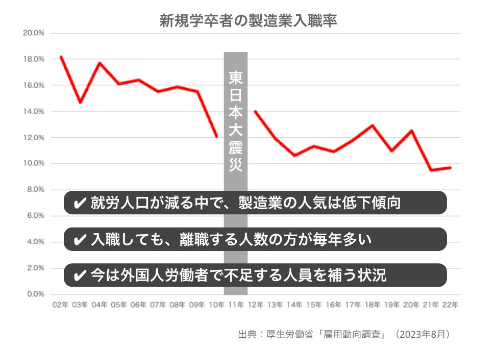 2010年頃から日本全体の出生数は一段と落ち込んでいます(2010年の出生数は約107万人⇨2023年は約73万人で30%強減少)。ですから、この世代が社会人になり始める2030年頃からは製造業への入職者は減ることが確実です。