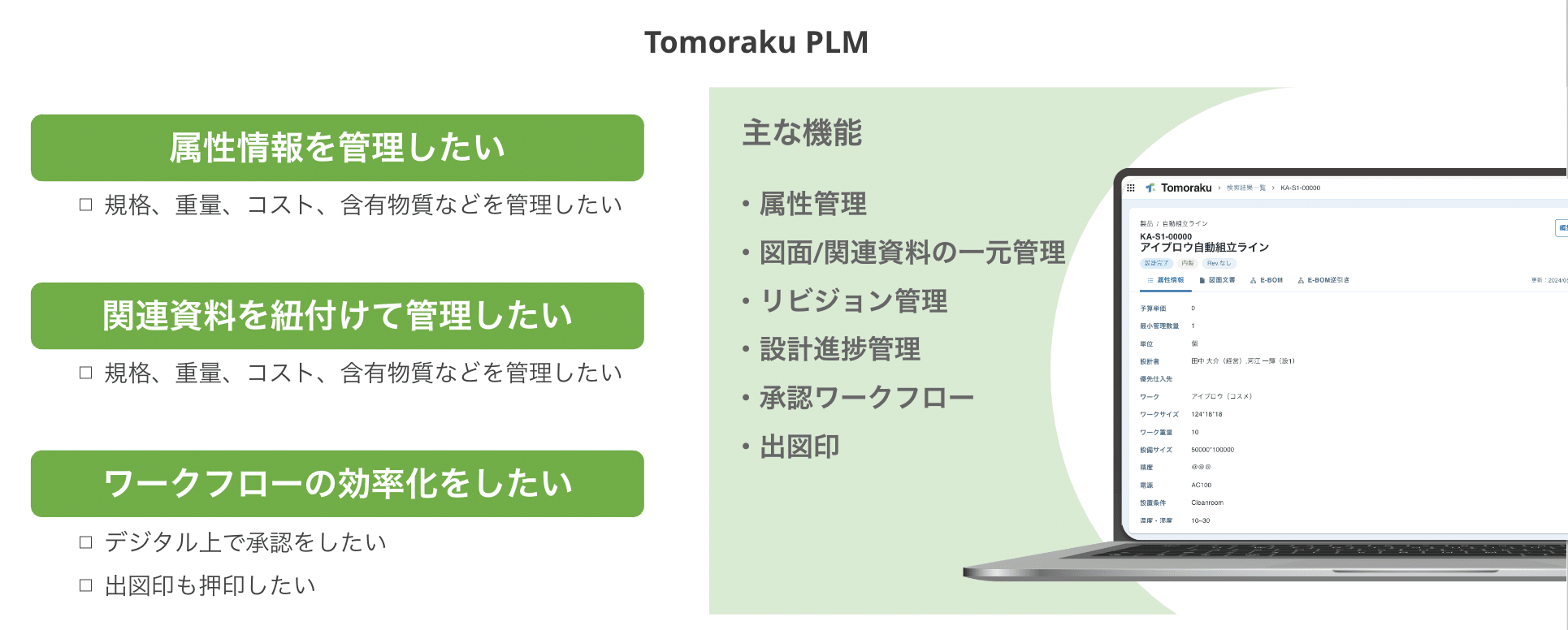 その先って何があるの?といえば、設計承認や出図などの業務フローをデジタル化したり、コストや含有物質、規制情報を品番ごとに管理できるようにしたり、図面や資料をただフォルダに置くところから一歩踏み込んでみましょうという提案をしています。