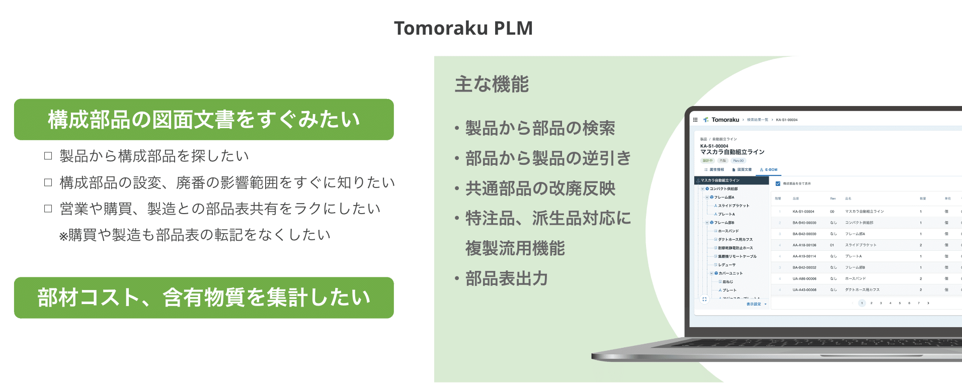 さらには、エクセルのBOMをみて1部品ずつ図面や関連資料を探して、、、というのは非効率ですからシステム上でBOM管理をしていつでも構成部品の図面や関連資料を見れたり、構成部品のコストや含有物質量の集計をできるようにしたり、ある部品が生産終了になった時に、他でどこに使われているかっていうのを逆展開できるようにしたり、という提案をして、設計スピード、効率の改善をお手伝いしています。